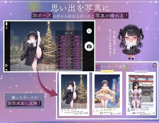 所有路线中都有可以拍摄照片的时机。姿势共有20种!用喜欢的姿势进行拍摄吧!拍摄并非结束,拍下的照片将成为回想模式的缩略图!